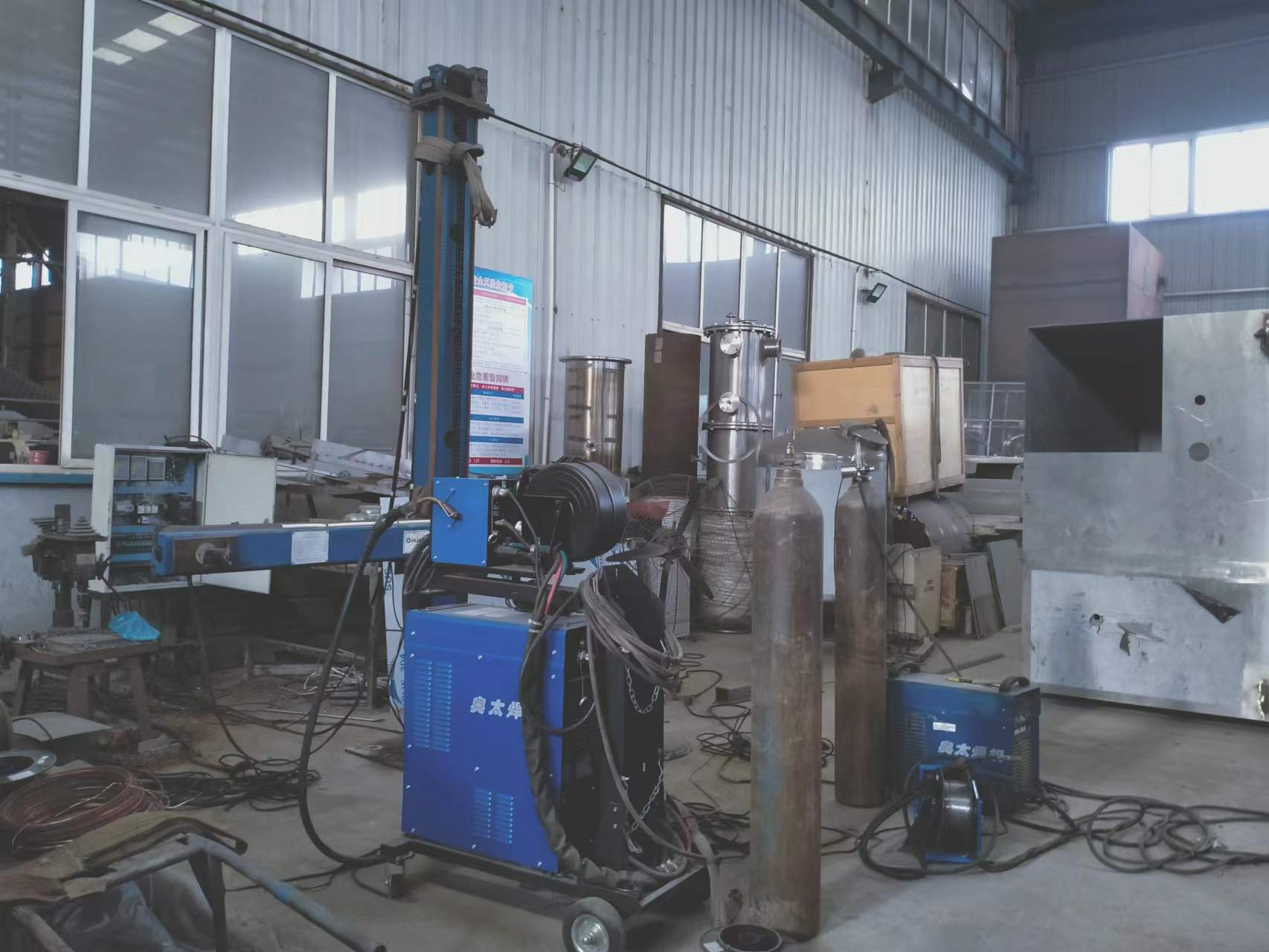 焊縫、縱縫自動焊機、等離子切割機、卷板機、封頭拋光機、滾筒拋光機等多種現(xiàn)代化智能生產(chǎn)設備。